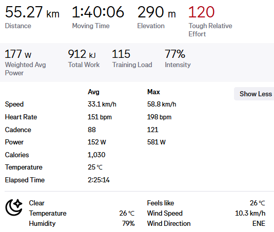 소토부터 언메까지 이동 평속 34.3 km/h, AP 181w, AHR 165 bpm