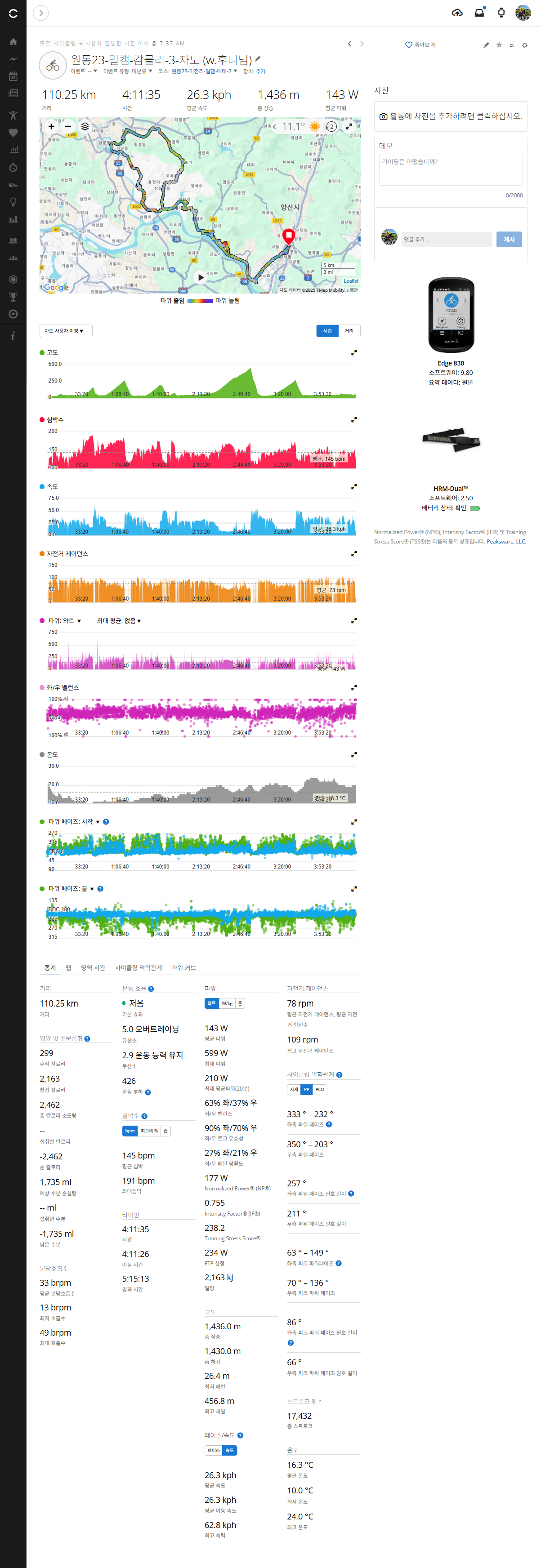 오르막은 보이지 않을 정도로 흘렀고 평지는 후니 님이 말선으로 끌어줬다. 2고개는 힘들어서 자도로 복귀.
