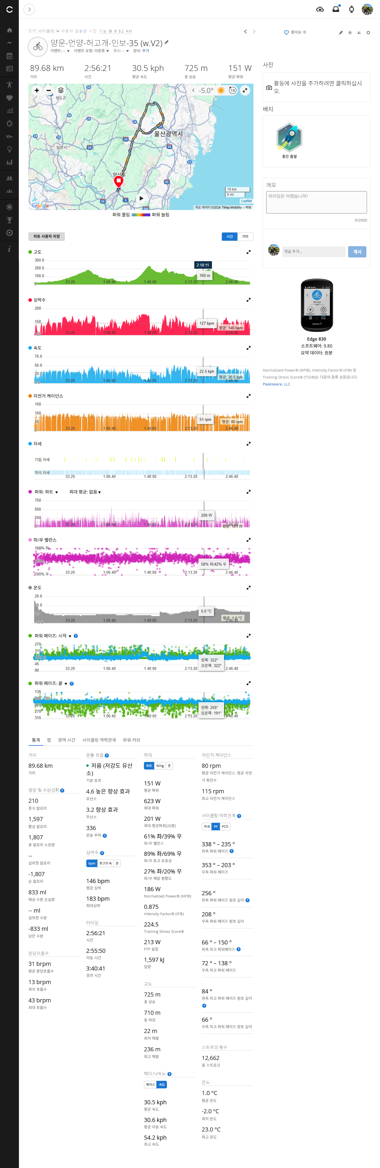 범서에서 허고개를 오르는 건 로그를 찾아보니 2021년 가을에 두 번 이후 몇 년만이었다. 심박을 너무 올리지 않게 타려고 했으나 기어 다 털어도 힘들어서인지 최대 183 bpm을 찍었다. 이전에는 최대 심박이 200 정도 나왔는데 무릎 부상으로 3주 쉰 후 로라를 타면 170 이상 올리기 힘들고 올리더라도 금세 다리가 잠겨서 고민이다. 필드는 조금 더 높게 나오나 이전보다 한참 낮다.